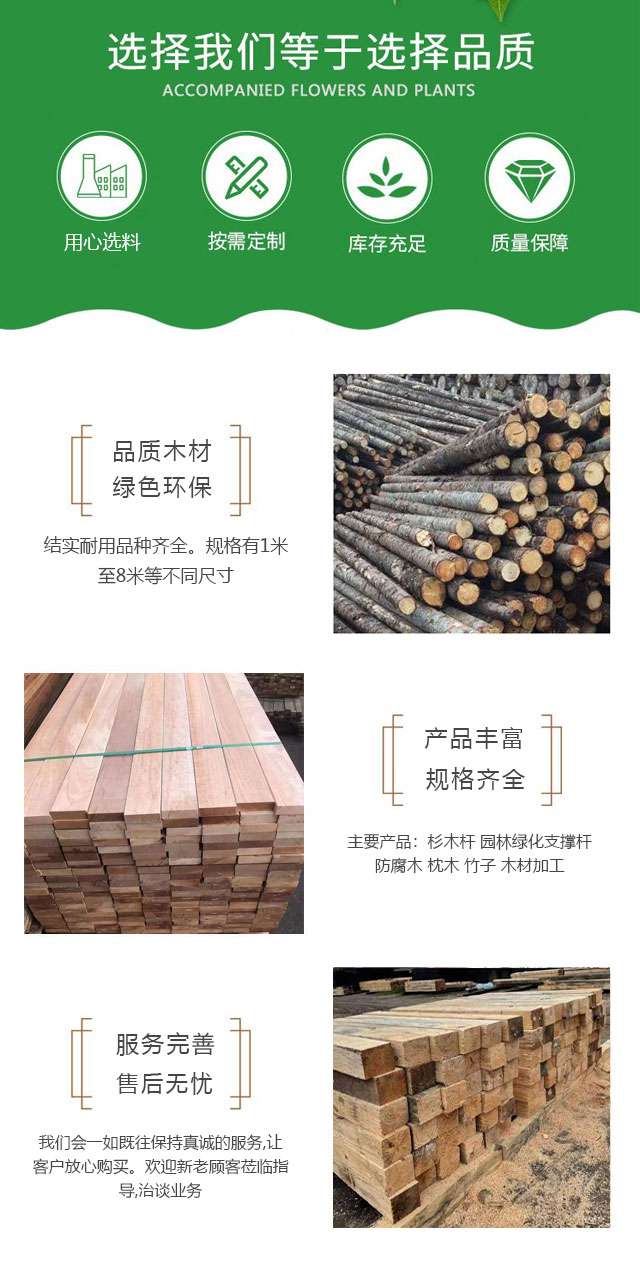 主要业务:经营洛阳园林绿化支撑杆、杉木杆、防腐木、竹子、仿古建筑木、枕木、木材加工等业务。